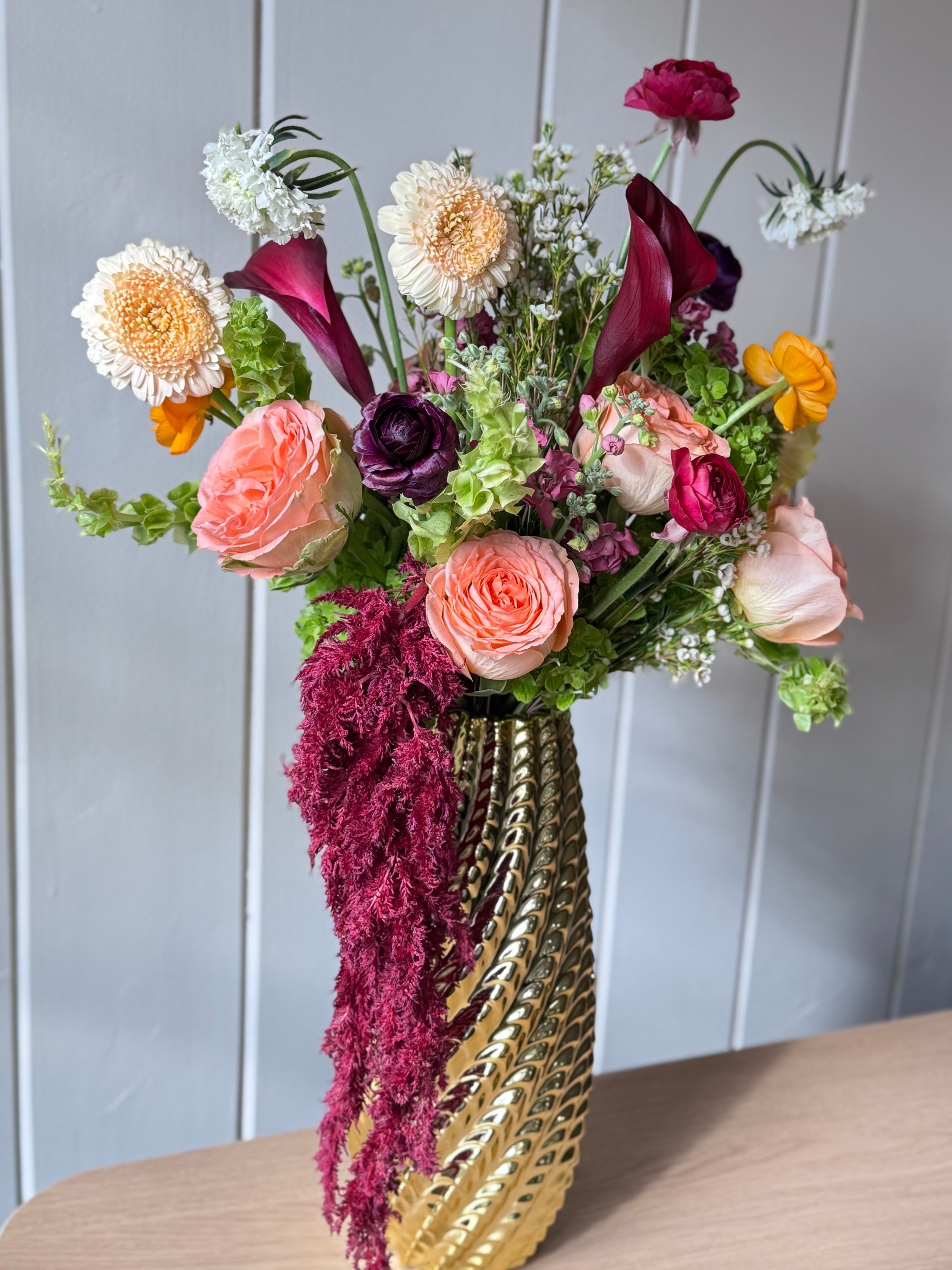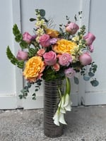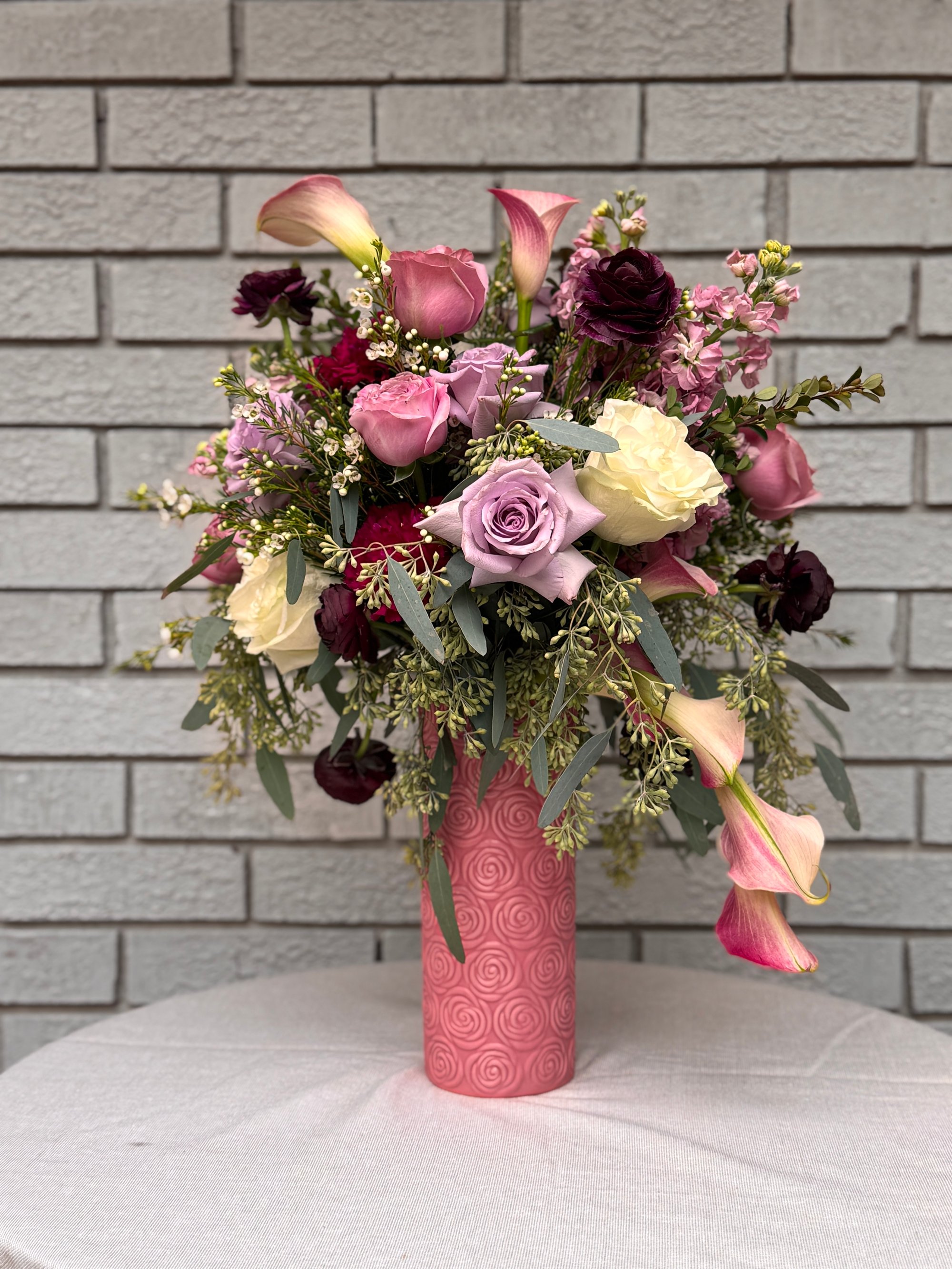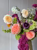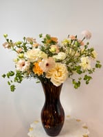 A lush, statement arrangement featuring premium seasonal blooms designed with depth, texture, and movement. Each piece is thoughtfully curated with high-end florals like garden roses and ranunculus for a romantic, elevated look.